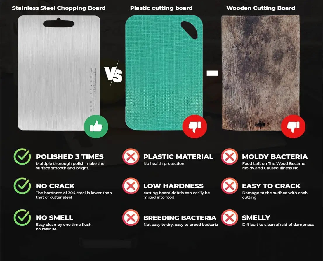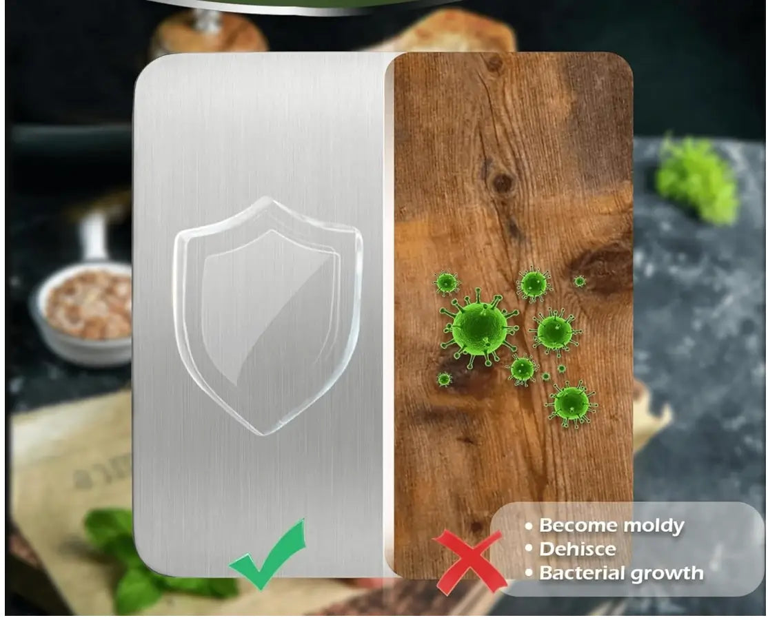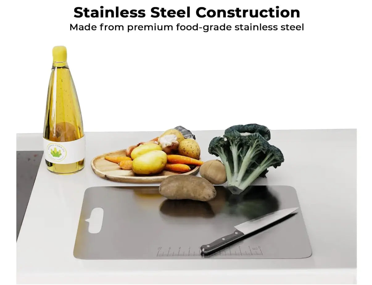 Say goodbye to worn-out wooden boards. Embrace durability, hygiene, and style with this stainless steel chopping board. Whether you're meal-prepping or cooking for family, enjoy a kitchen tool that supports your passion with ease and elegance.